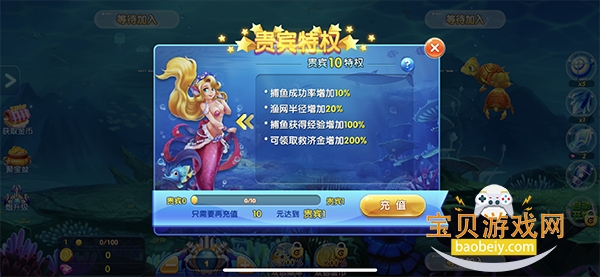 《海王捕鱼手游》中设置了10个等级的贵宾等级,等级越高特权福利越好。充值10元即可获得最初的贵宾等级,可以赠送道具,捕鱼获得经验增加10%,可领取救济金增加20%;等级提升至10级则捕鱼成功率增加10%,渔网半径增加20%,捕鱼获得经验增加100%,可领取救济金增加200%。