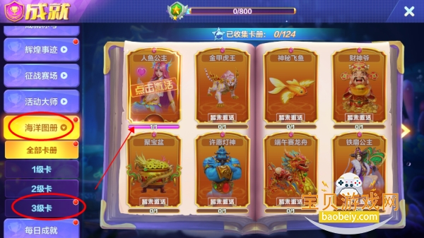 2、找到海洋图册中亮红点的卡册,即可看到可以解锁的卡册,如“人鱼公主”