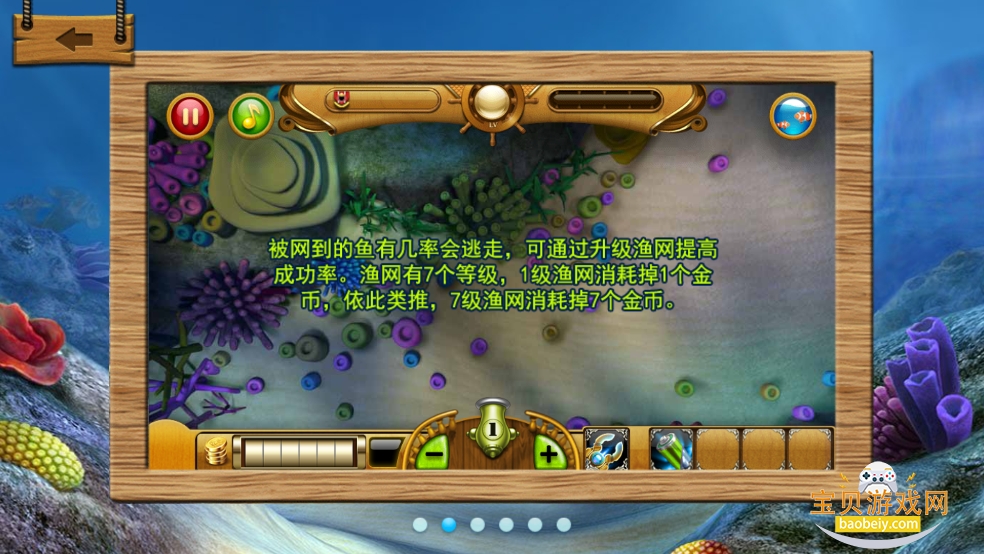 被网到的鱼有几率会逃走,可通过升级渔网提高成功率。渔网有7个等级,1级渔网消耗掉1个金币,依此类推,7级渔网消耗掉7个金币。