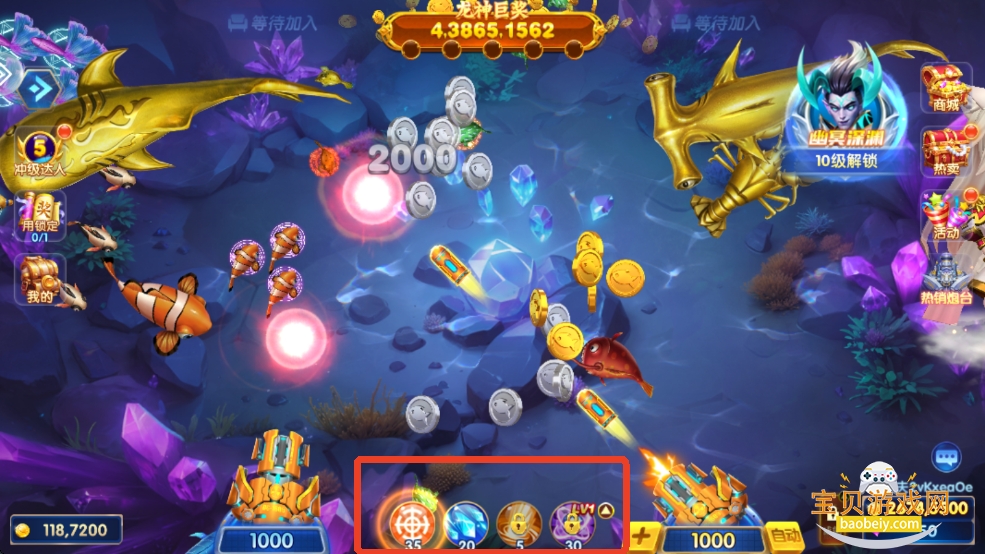 电玩捕鱼里有丰富的道具可以给我们选择,炮塔旁边的2个性价比最高,也是我用的最多的,BOSS来了用追踪,大鱼要是很多,来不及打,也可以冰冻。