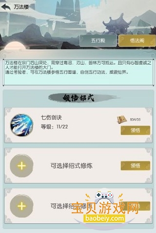 打开这个界面我们就可以看到这个玩法的主界面啦,分为五行殿和悟法阁,其中悟法阁是继续提升招式等级的地方。之前的招式等级上限是10级,在悟法阁可以选择继续提升招式的等级了。
