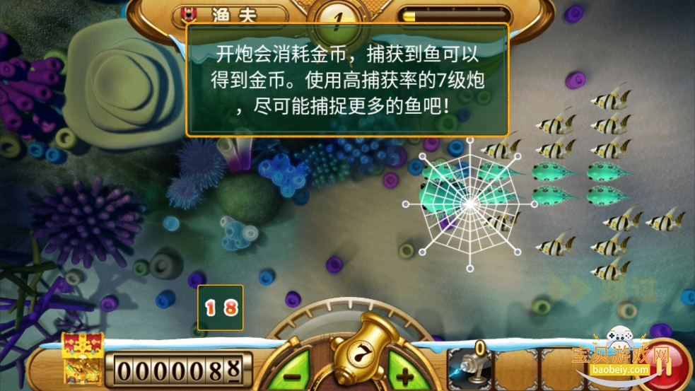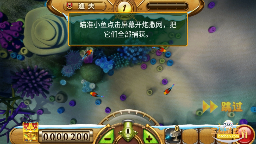 1、玩家进入游戏后,操控炮台,瞄准小鱼点击屏幕开炮撒网,把它们全部捕获。