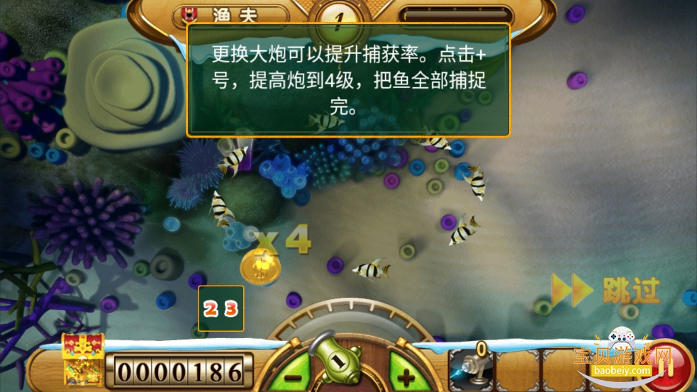3、更换大炮可以提升捕获率。点击+号,提高炮到4级,把鱼全部捕捉完。