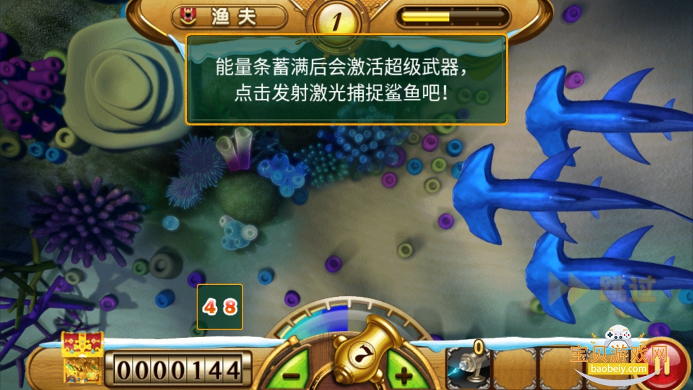 6、能量条蓄满后会激活超级武器点击发射激光捕捉鲨鱼吧!