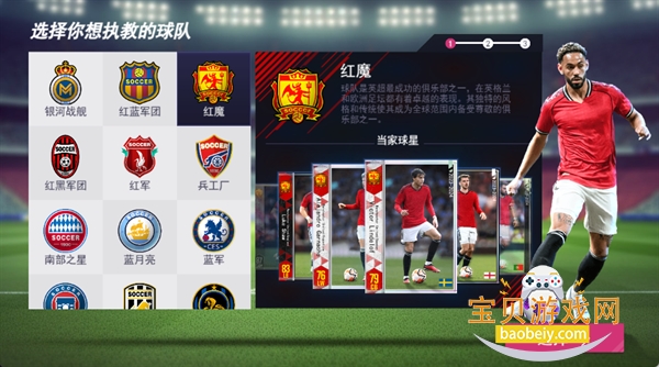 选择你想执教的球队,可挑选如 “红魔” 等风格各异的球队,不同球队有独特当家球星和背景,选队时可结合自身对球队风格的偏好来决定。