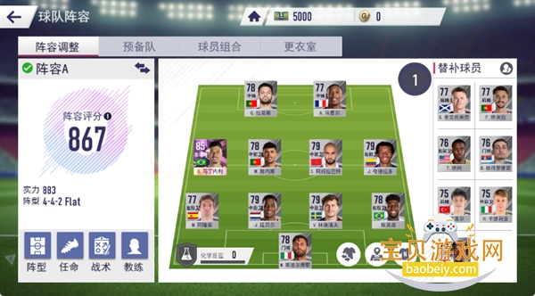 管理球队阵容,可调整阵型(如 4-4-2 Flat)、进行球员任命、制定战术和选择教练,同时关注阵容评分与化学反应,优化球队战力。