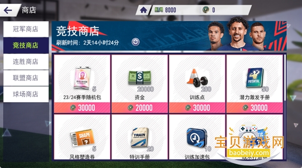 在商店中,可使用赛事获得的货币兑换赛季随机包、训练点、潜力激发手册等资源,助力球队阵容和战术升级。