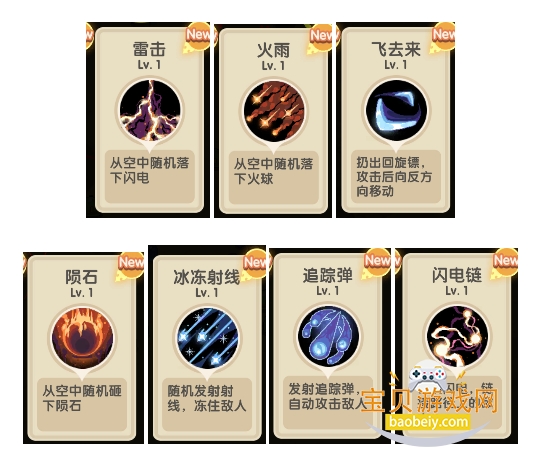 闪电链、追踪弹、冰冻射线、飞去来同类技能,均为自动索敌技能,前期因为范围较大较为好用,在关卡后期伤害略显不足,可根据实际需求选择。其中,冰冻射线附带冰冻控制效果,在某些情况下相对好用。