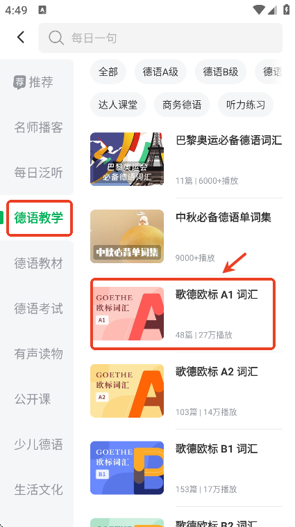 同步双语字幕与单词学习:听力材料均配备双语字幕,播放时结合“德语助手”,长按单词可即时翻译并收藏生词,方便用户边听边学词汇,提高词汇量。