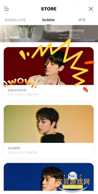 在bubble软件的bubble泡泡专区中购置本人喜欢的爱豆的泡泡业务,点击爱豆头像就能够和喜欢的爱豆聊天了,但是泡泡内的一切内容都是私密的,不允许外传的。