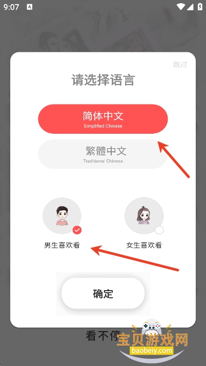 打开app,用户们可以选择软件语言,是“简体中文”还是“繁体中文”,用户们也可以选择阅读口味,是男频小说还是女频小说