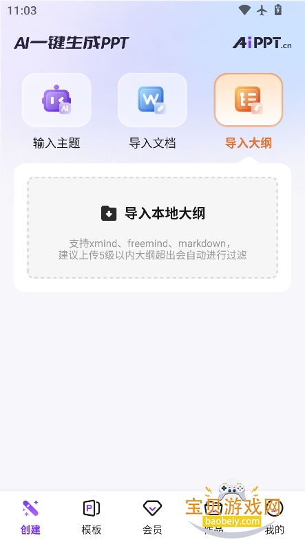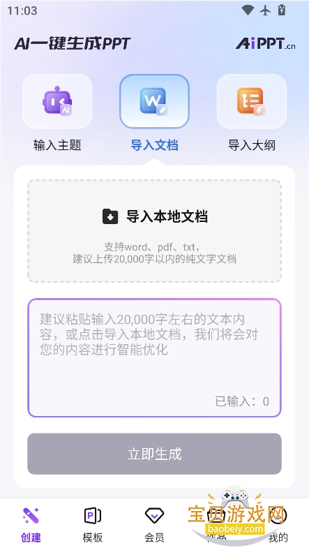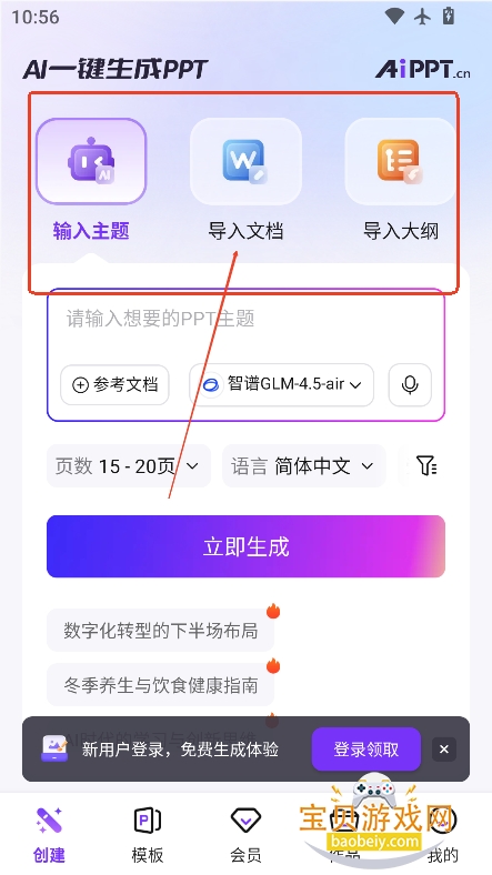1、进入首页,支持输入主题,导入文档,导入大纲等三种生成方式,可以任意选择一种自己喜欢的方式进行生成