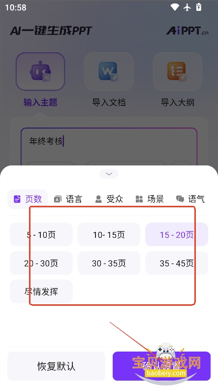 3、然后选择ppt页数,场景等,点击确认设置