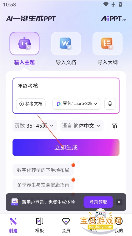 ②智能生成:进入“智能生成”页面,输入300字内的主题需求(建议明确行业、核心内容),选择商务极简、学术严谨等免费基础风格,点击生成即可获取PPT初稿;