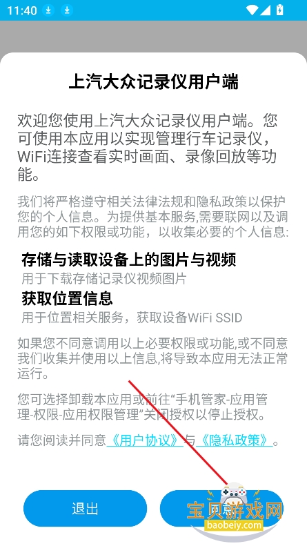 1、在宝贝游戏网下载安装上汽大众记录仪客户端app下载官方版,点击“同意”进入