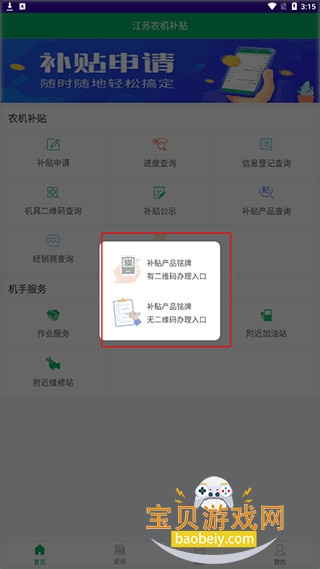 1、打开江苏农机补贴app最新版,进入首页点击申请补贴。