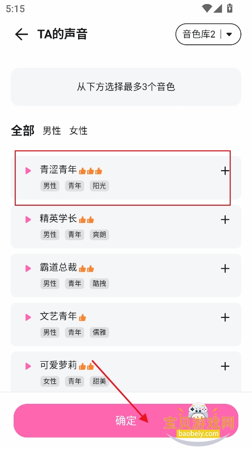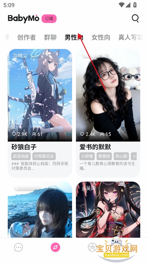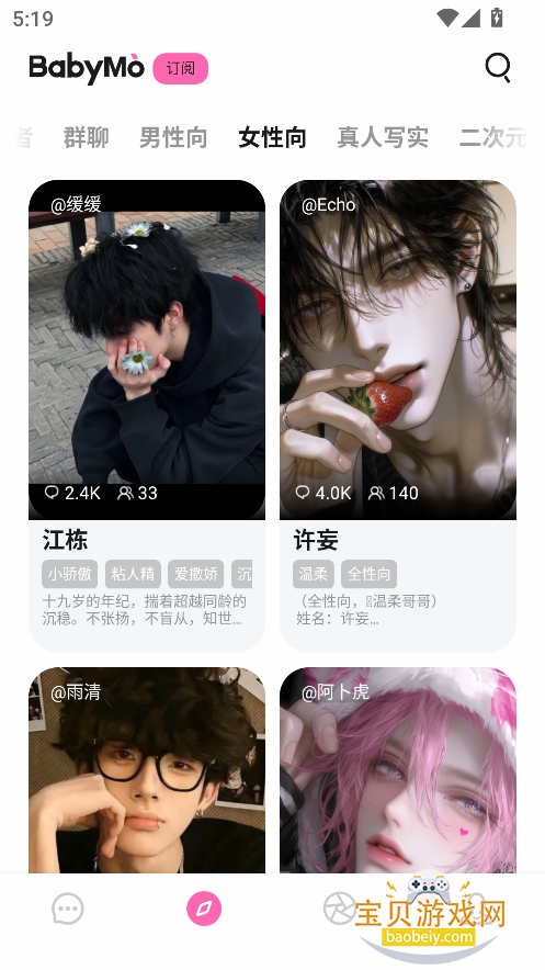 1、进入首页,筛选喜欢的虚拟角色类型,男性向,女性向一应俱全,可以根据需求进行切换