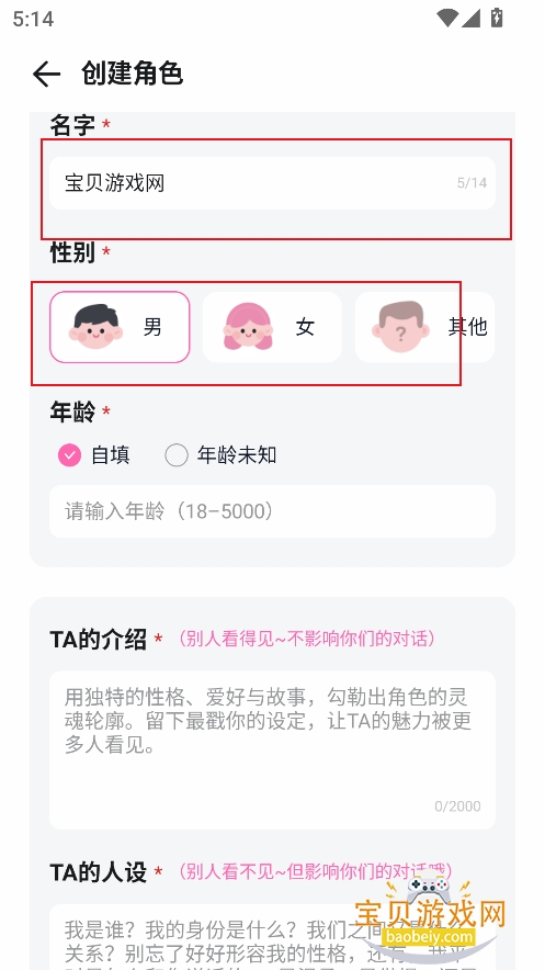 3、输入角色名称,性别,以及年龄等参数