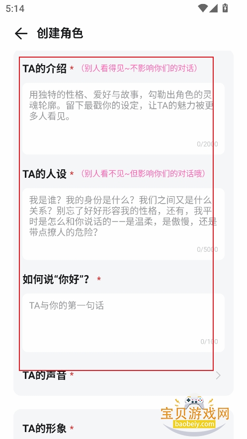 4、继续填写介绍,人设,关键词标签等参数