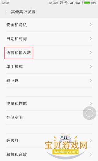 3、接下来,在系统高级设置页面中我们可以看到“语言和输入法”选项,点击之后即可进入输入法设置页面。