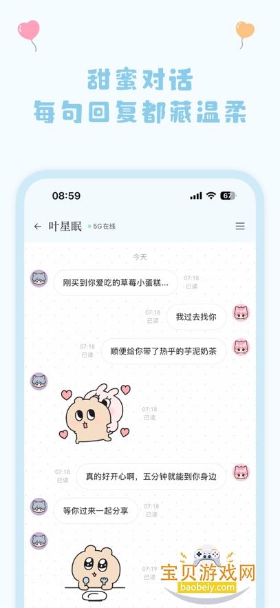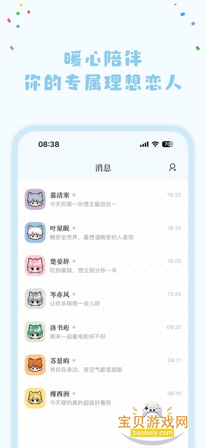 支持设置早安、晚安问候,定时提醒喝水、休息,甚至能陪你一起“云养宠”、“云吃饭”。模拟真实的恋爱或交友日常,让你时刻感觉有人在关心你。