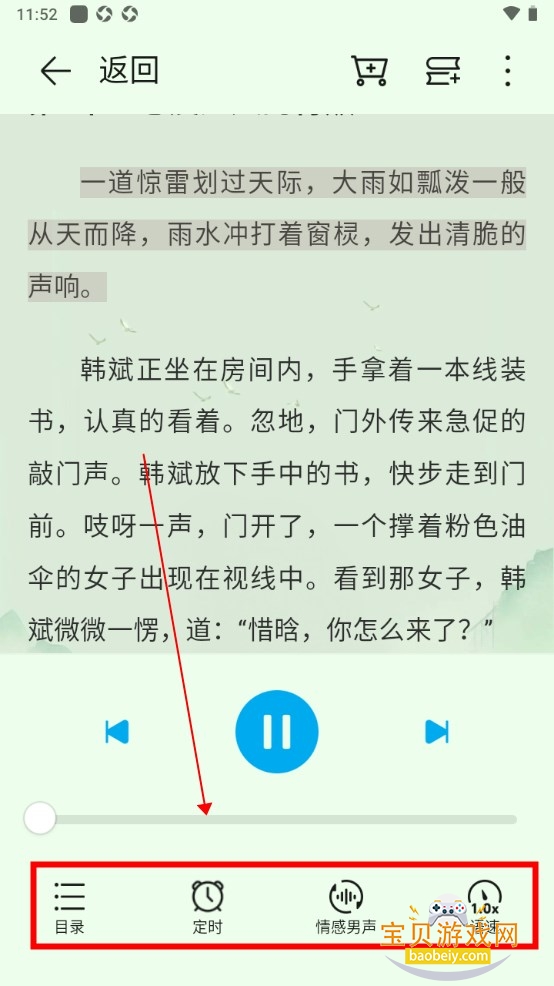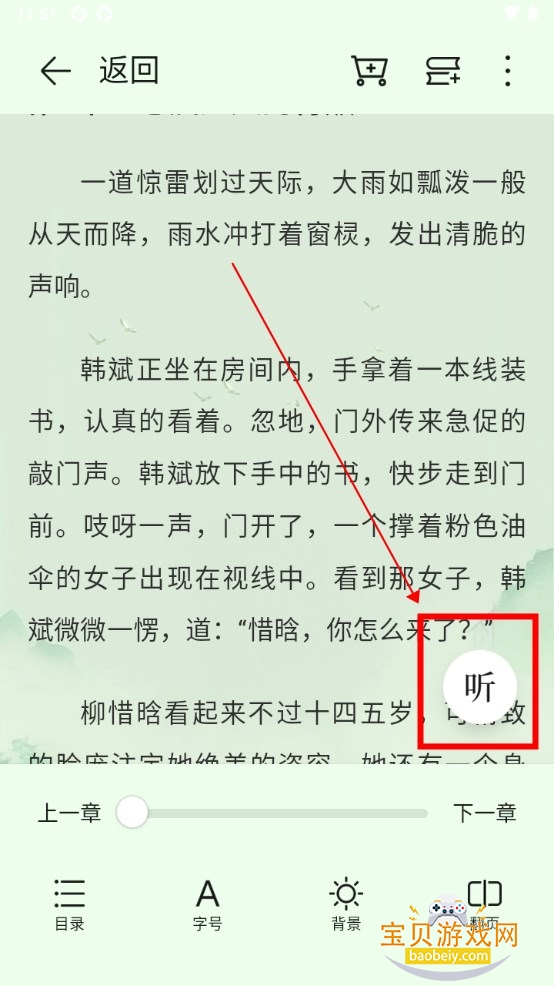 点击屏幕右下方的“听”,即可进入听书模式。