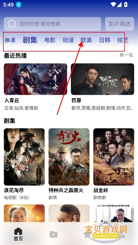 1、进入首页,筛选追剧类型,各种综艺,电影,电视剧等一键切换