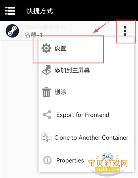 15、安装好后,退出重进软件,在快捷方式中,点击steam快捷方式旁的三点标识,选择【设置】。
