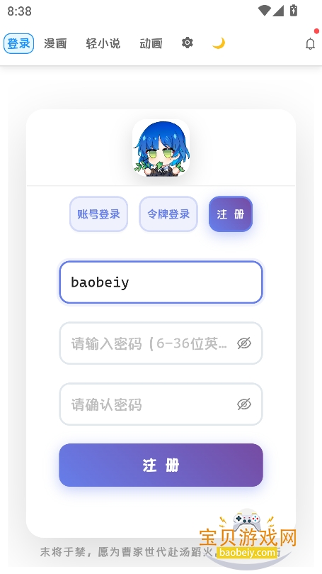3、新用户直接点击注册,进入注册界面,任意输入账号密码,就可以完成注册