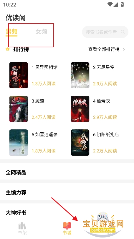 1、进入【书城】界面,可以查看男频,或者女频小说资源