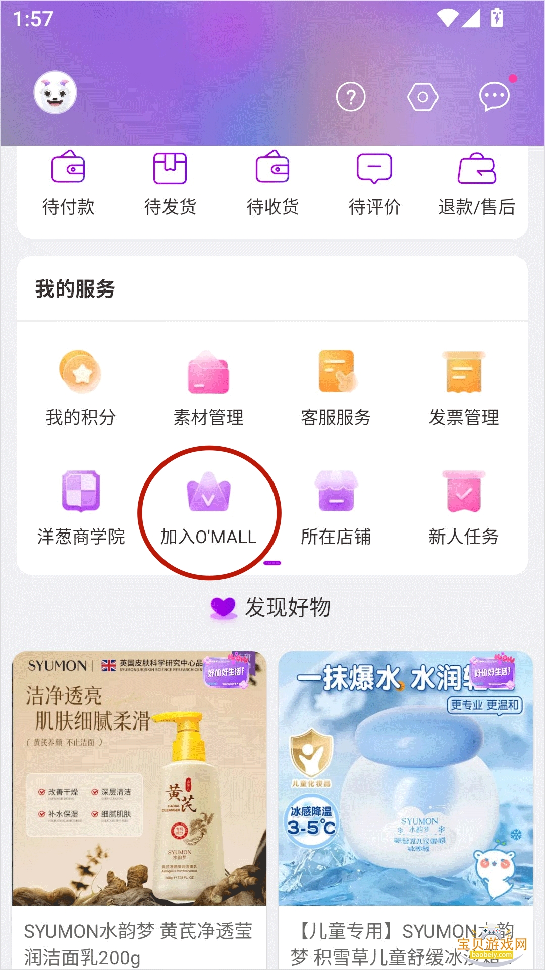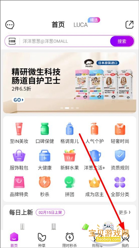 1、打开洋葱海外仓app,登录进入首页,首页有推荐以及商品分类栏目(美妆、育儿、轻奢、服饰、水果等),点击我的