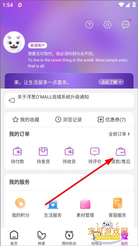 2、我的页面用户可查看浏览记录、收藏、优惠券、我的订单、我的服务(积分、生活服务、客服服务等),点击退款/售后