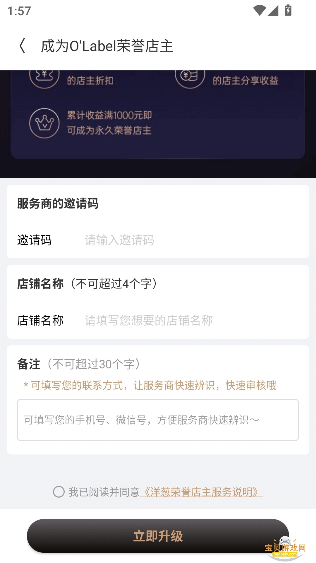 4、选好以后输入邀请码、填写店铺名称、勾选“我已阅读并同意《洋葱荣誉店主服务说明》”,点击“立即升级”