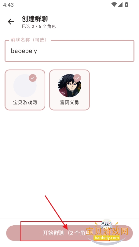 3、输入群昵称,勾选角色,至少两个角色,点击【开始群聊】