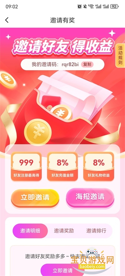 邀请好友注册并使用App,可获得邀请奖励金币,好友越多,金币收益越高。