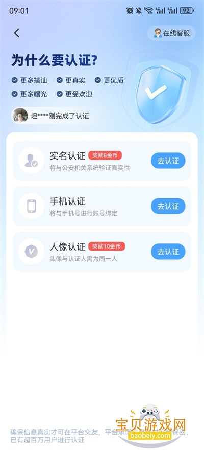 完成实名认证,不仅提升账户安全,还可获得系统赠送的金币。