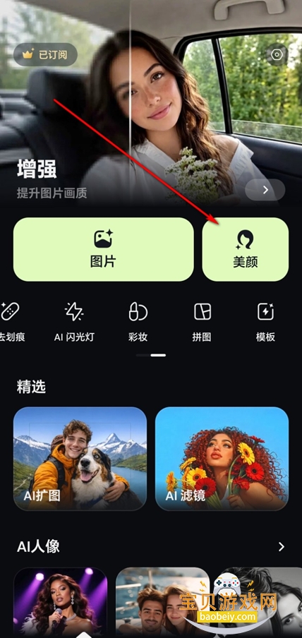 1、进入首页,提供超多图片美化功能,以及修图功能,可以选择你需要的功能,例如选择【美颜】