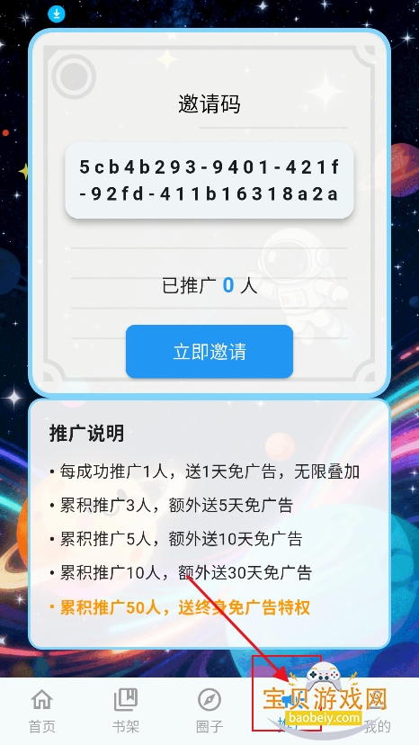 进入【推广】界面,邀请朋友们加入,就可以免广告获得会员体验