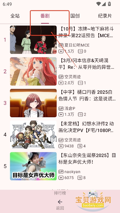 例如进入排行榜,切换到番剧,可以查看近期热榜